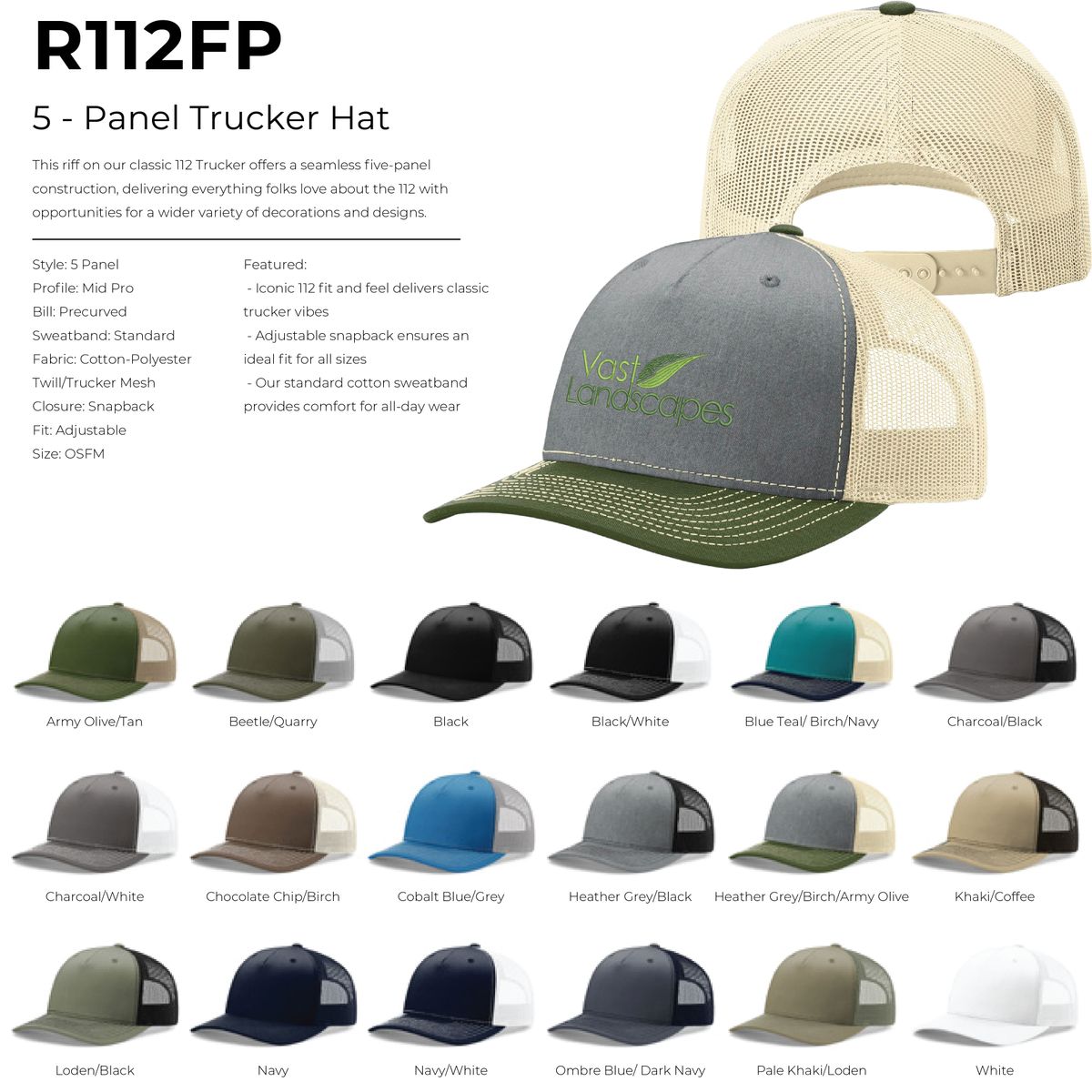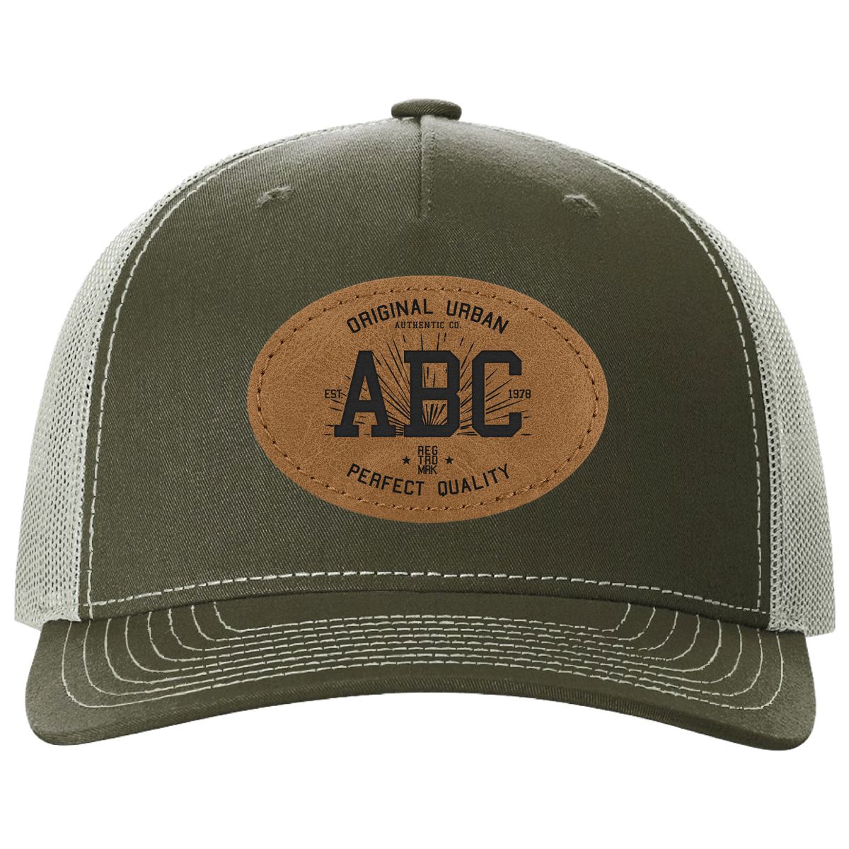 This five-panel Richardson 112FP snapback trucker hat with leatherette adhesive patches or Embroidery make the perfect gift for hat lovers. This product has 13 different hat colors. Create the perfect combination that fits your needs! Hats are 40/60 cotton/polyester blend and has a 100% polyester mesh back. The under bill of the hat matches the color of the visor and has an adjustable plastic snapback. Embroidery up to 5,000 stitches is also included in the cost. Custom patches are also available - call upon request.